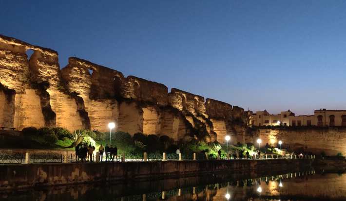 Among the most jaw-dropping structures anywhere in Morocco, the Heri es-Souani is the surviving portion of Sultan Moulay Ismail’s legendary granaries and stables complex. The scale is extraordinary — vast barrel-vaulted chambers, built with walls several metres thick to maintain cool temperatures, stretch in long rows across a wide site. Originally capable of storing grain for decades and stabling thousands of horses, the ruins today carry an almost cinematic grandeur. The nearby Agdal Basin — a vast ornamental reservoir built to irrigate the royal gardens — adds a serene counterpoint to the architectural drama.